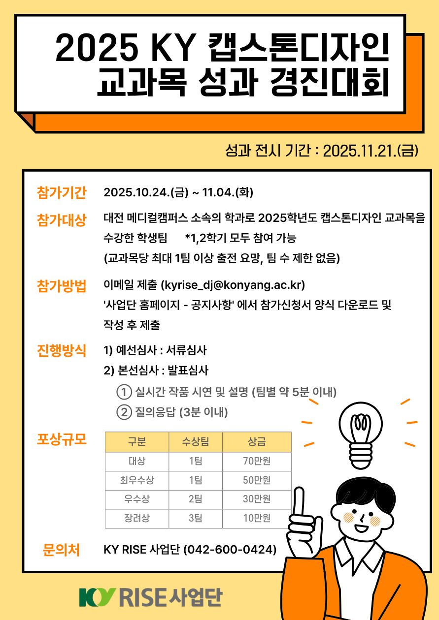 | 제목 | [메디컬RISE사업] 2025학년도 캡스톤디자인 교과목 성과 경진대회 | ||||